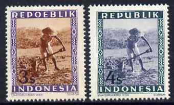 Indonesia 1948-49 perforated 4s (inscribed Republik) & 3s (inscribed Repoeblik) essays showing farmer, prepared for postal use but not issued, unmounted mint