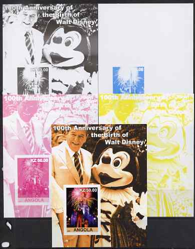Angola 2001 Birth Centenary of Walt Disney #10 s/sheet - Disneyland Fireworks & Ronald Reagan - the set of 5 imperf progressive proofs comprising the 4 individual colours plus all 4-colour composite, unmounted mint