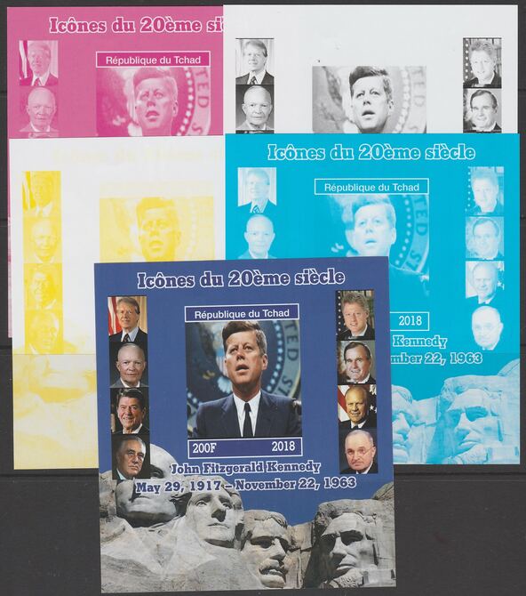 Chad 2018 Icons of 20th Century - J F Kennedy - imperf set of 5 progressive sheets comprising the 4 individual colours and completed design unmounted mint. Note this item is privately produced and is offered purely on its thematic appeal
