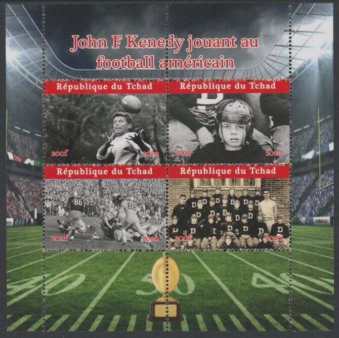 Chad 2020 John F Kennedy Playing American Football perf sheet containing 4 values unmounted mint. Note this item is privately produced and is offered purely on its thematic appeal