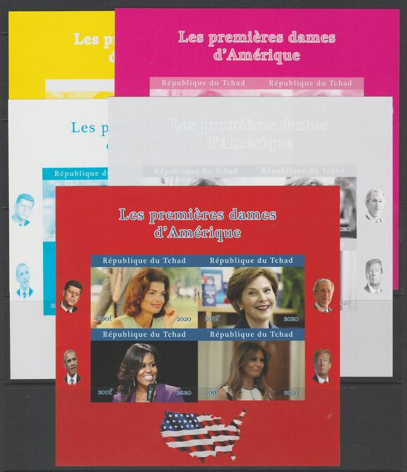 Chad 2020 US First Ladies - Kennedy,Obama, Trump & Bush imperf set of 5 progressive sheets comprising the 4 individual colours and completed design unmounted mint. Note this item is privately produced and is offered purely on its thematic appeal