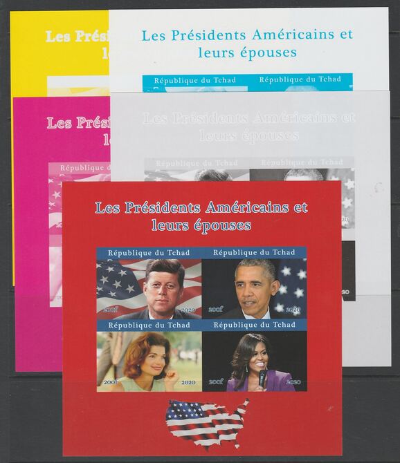 Chad 2020 US Presidents & First Ladies - the Kennedys & Obamas imperf set of 5 progressive sheets comprising the 4 individual colours and completed design unmounted mint. Note this item is privately produced and is offered purely on its thematic appeal