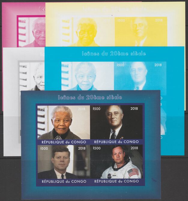 Congo 2018 Icons of 20th Century - J F Kennedy, Mandela, Neil Armstrong & F D Roosevelt - imperf set of 5 progressive sheets comprising the 4 individual colours and completed design unmounted mint. Note this item is privately prod……Details Below