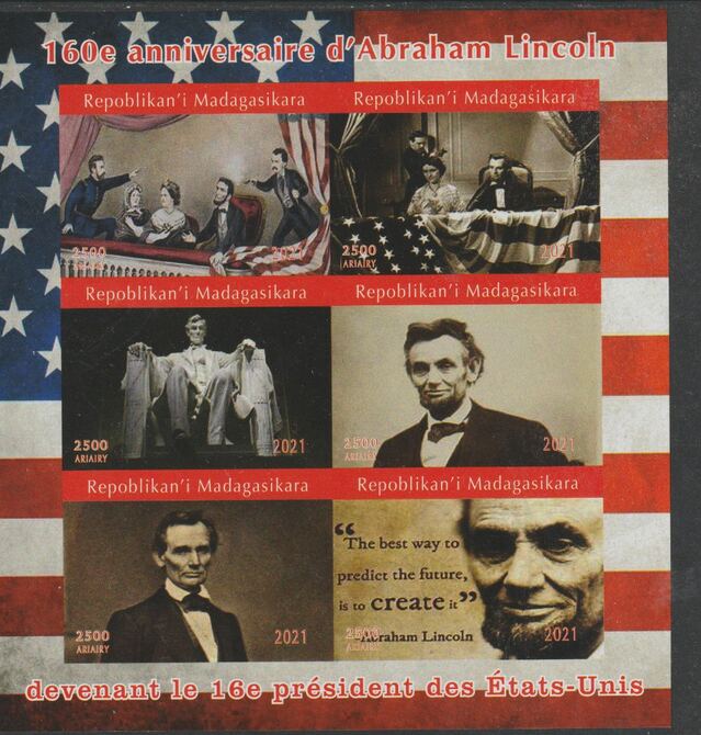 Madagascar 2021 160th Anniversary of Inauguration of Abraham Lincoln imperf sheetlet containing 6 values unmounted mint. Note this item is privately produced and is offered purely on its thematic appeal