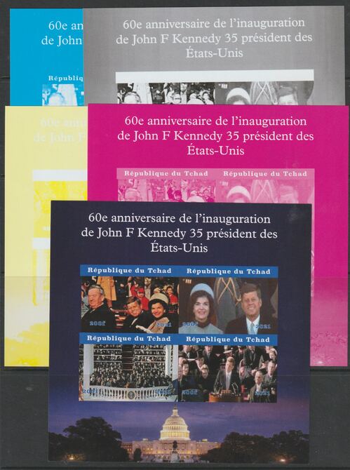 Madagascar 2021 60th Anniversary of Inauguration of President Kennedy #2 imperf sheetlet containing 4 values - the set of 5 imperf progressive proofs comprising the 4 individual colours plus all 4-colour composite, unmounted mint