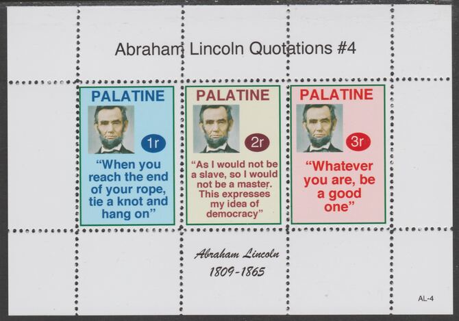Palatine (Fantasy) Quotations by Abraham Lincoln #4 perf deluxe glossy sheetlet containing 3 values each with a famous quotation,unmounted mint