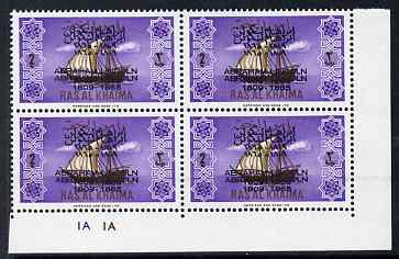 Ras Al Khaima 1965 Ships 2r with Abraham Lincoln overprint doubled, unmounted mint plate block of 4, SG 19var