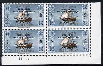 Ras Al Khaima 1965 Ships 5r with Abraham Lincoln overprint inverted, unmounted mint plate block of 4, SG 20var
