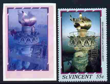 St Vincent 1986 Statue of Liberty Centenary 55c die proof in red and blue only on plastic (Cromalin) card ex archives complete with issued perf stamp as SG 1037