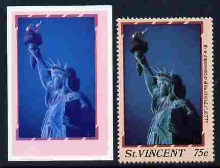 St Vincent 1986 Statue of Liberty Centenary 75c die proof in red and blue only on plastic (Cromalin) card ex archives complete with issued perf stamp as SG 1038