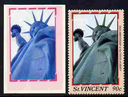 St Vincent 1986 Statue of Liberty Centenary 90c die proof in red and blue only on plastic (Cromalin) card ex archives complete with issued perf stamp as SG 1039