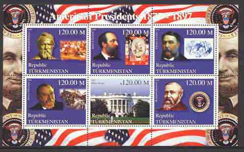 Turkmenistan 2000 US Presidents #03 perf sheet of 6 unmounted mint, containing Hayes, Garfield, Arthur, Cleveland & Harrison, background shows Trains, Horses, & Red Indians