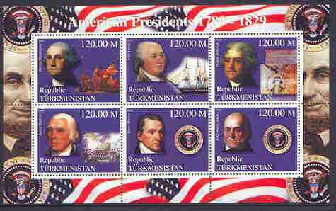 Turkmenistan 2000 US Presidents #07 perf sheet of 6 unmounted mint, containing Washington, J Adams, Jefferson, Madison, Monroe & J Q Adams, background shows Ships & Militaria