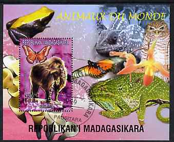 Madagascar 1999 Animals of the World #01 perf m/sheet showing Baboon, background shows Frog, Owl, Butterfly, Chameleon & Orchid, fine cto used