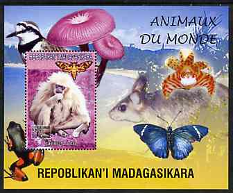 Madagascar 1999 Animals of the World #04 perf m/sheet showing Gibbon Monkey, background shows Frog, Bird, Butterfly, Fungi & Orchid, unmounted mint