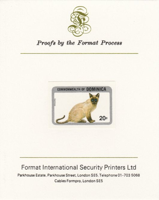 Dominica 1984 Cats 20c (Siamese) imperf proof mounted on Format International proof card as SG 914