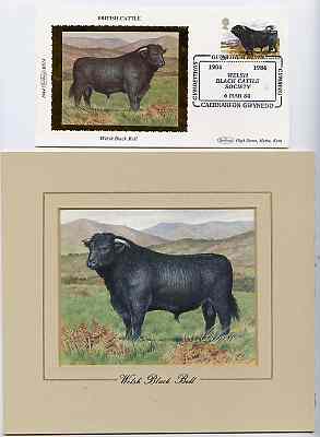 Great Britain 1984 British Cattle - original hand-painted artwork of Welsh Black Bull as used (in reverse) to illustrate Benham silk first day cover (28p value), approx 5" x 4" plus the matching Benham silk cover, a magnificent and attractive unit