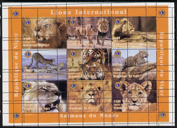 Niger Republic 1998 Animals of the World #2 (Big Cats) perf sheetlet containing 9 x 250f values each with Lions International logo with quadrupal perforations unmounted mint as Scott #1004