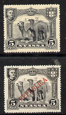 Nyassa Company 1911 Dromedaries 5r with REPUBLICA overprint omitted plus normal both mounted mint, SG 54var