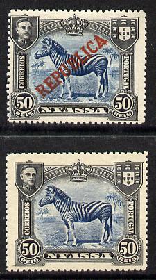 Nyassa Company 1911 Zebra 50r with REPUBLICA overprint omitted plus normal both mounted mint, SG 58var
