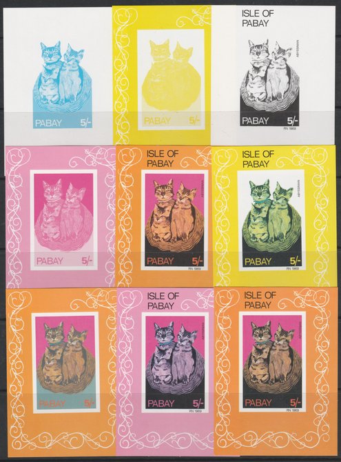 Pabay 1969 Abyssinian Cat 5s m/sheet - the set of 9 imperf progressive proofs comprising the 4 individual colours, four 3-colour composite plus all 4 colours, unmounted mint