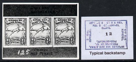 South Africa 1926-27 issue B&W photograph of original 1/2d Springbok essays in strip of 3. Official photograph from the original artwork held by the Government Printer in Pretoria with authority handstamp on the back, one of only 30 produced.