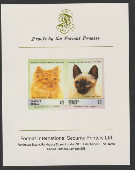 Tuvalu - Nanumea 1985 Cats $1 Long Haired Ginger & Siamese Seal Point (Leaders of the World) imperf se-tenant pair mounted on Format International proof card