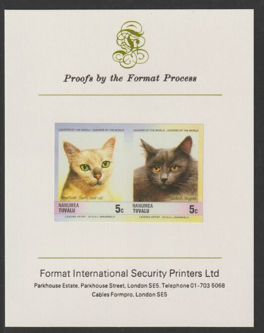 Tuvalu - Nanumea 1985 Cats 5c American Short-hair & Turkish Angora (Leaders of the World) imperf se-tenant pair mounted on Format International proof card