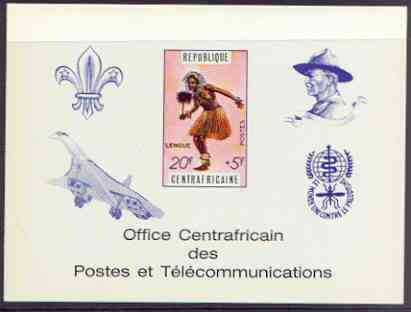 Central African Republic 1971 Traditional Dances 20f + 5f deluxe proof card in full issued colours (as SG 234) opt'd in blue showing Scout logo, Baden Powell, Concorde & Anti Malaria Logo