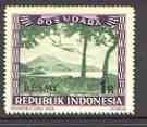 Indonesia 1948-49 perforated 1R produced by the Revolutionary Government in green & purple showing plane through trees, opt'd 'RESMI' (prepared for Official use) without gum