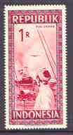 Indonesia 1948-49 perforated 1R produced by the Revolutionary Government in magenta & blue showing plane over ship, prepared for postal use, without gum