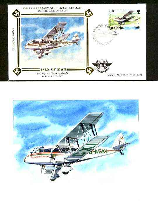 Isle of Man 1984 50th Anniversary of First Air Mail & ICAO Anniversary - original hand-painted artwork by A D Theobald showing Railway Air Services DH 84, as used to illustrate Benham silk first day cover (11p value), mounted on board 6" x 4.5" plus the matching Benham silk cover, a magnificent and attractive unit