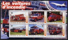 Ivory Coast 2003 Fire Engines #1 perf sheetlet containing set of 6 values (each with Scout Logo & Concorde in Margin) unmounted mint