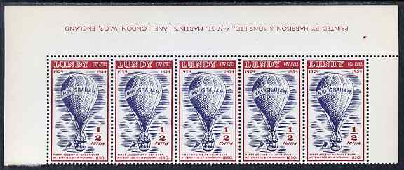 Lundy 1954 definitive Airmail with dates 1/2p Mrs Graham's Balloon marginal strip of 3, last stamp with variety 'flaw after 'N' of Puffin' unmounted mint Rosen LU 99var