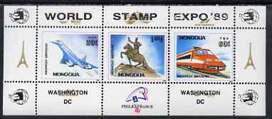 Mongolia 1989 World Stamp Expo overprinted on 'Philexfrance 89' Stamp Exhibition (2nd issue) perf m/sheet (Concorde,TGV Train, Statue) unmounted mint, SG MS 2072