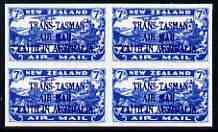 New Zealand 1934 Trans-Tasman Faith in Australia 7d blue imperf block of 4 being a 'Hialeah' forgery on gummed paper (as SG 554)