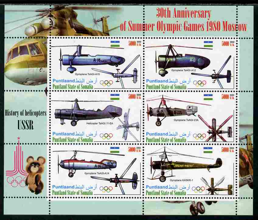 Puntland State of Somalia 2010 30th Anniversary of Moscow Olympics - Russian Helicopters #2 perf sheetlet containing 6 values unmounted mint
