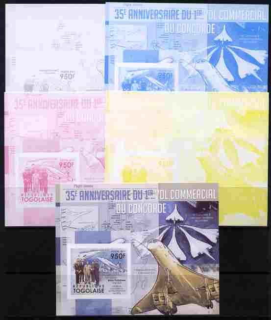 Togo 2011 35th Anniversary of 1st Commercial Flight of Concorde #3 deluxe sheet - the set of 5 imperf progressive proofs comprising the 4 individual colours plus all 4-colour composite, unmounted mint