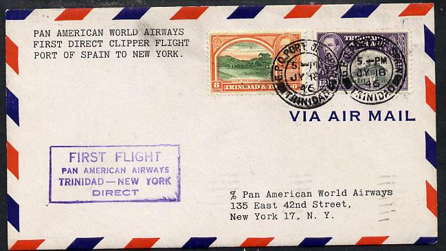Trinidad & Tobago 1946 Pan American Airways First Clipper Air Mail Flight cover to USA with special 'Trinidad - New York' Cachet and bearing KG6 8c & 12c adhesives