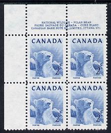 Canada 1953 Wildlife Week 2c Polar Bear corner plate No.1 block of 4 unmounted mint, SG 447