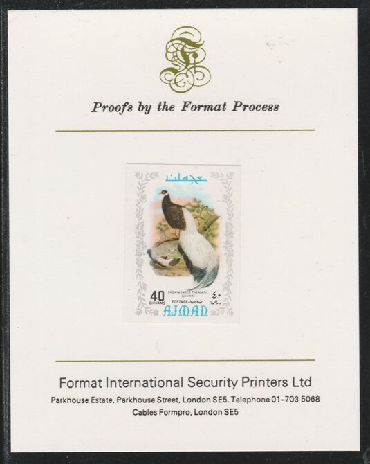 Ajman 1971 Exotic Birds - Brown-Eared Pheasant 40Dh imperf mounted on Format International proof card as Mi 890B