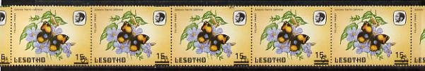 Lesotho 1986-88 Butterflies Yellow Pansy 15s on 5s unmounted mint strip of 7 with progressive shift of surch (bars top & bottom) SG 727