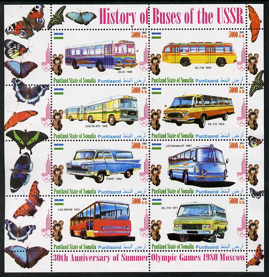 Puntland State of Somalia 2011 Buses of the USSR #1 perf sheetlet containing 8 values (Butterflies & Mosco Olympic Logo in margin) unmounted mint