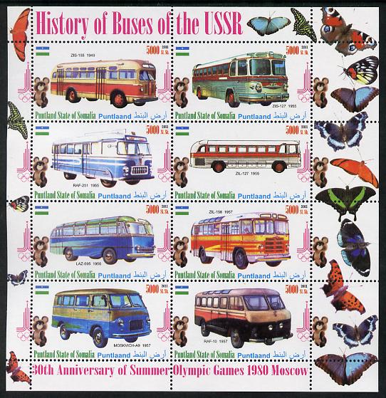 Puntland State of Somalia 2011 Buses of the USSR #2 perf sheetlet containing 8 values (Butterflies & Mosco Olympic Logo in margin) unmounted mint
