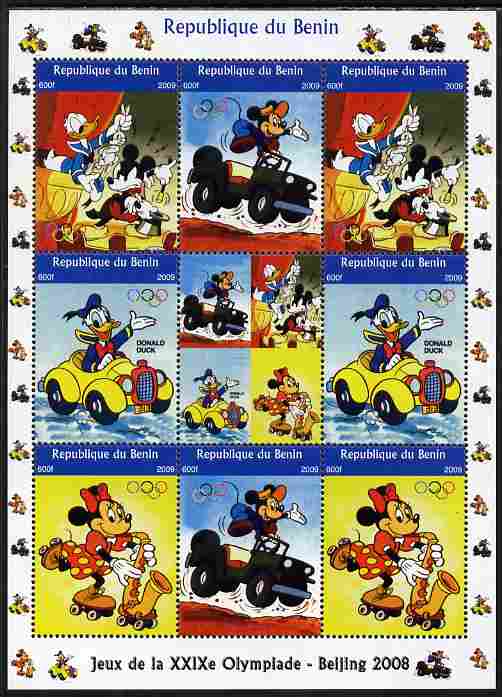 Benin 2009 Beijing Olympics #5 - Disney Characters (Mickey, Minnie & Donald) perf sheetlet containing 8 values plus label unmounted mint. Note this item is privately produced and is offered purely on its thematic appeal