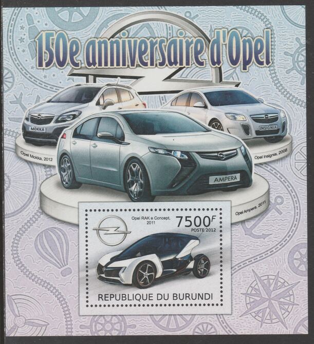 Burundi 2012 150th Anniv of Opel perf souvenir sheet,containing 1 value unmounted mint.t.