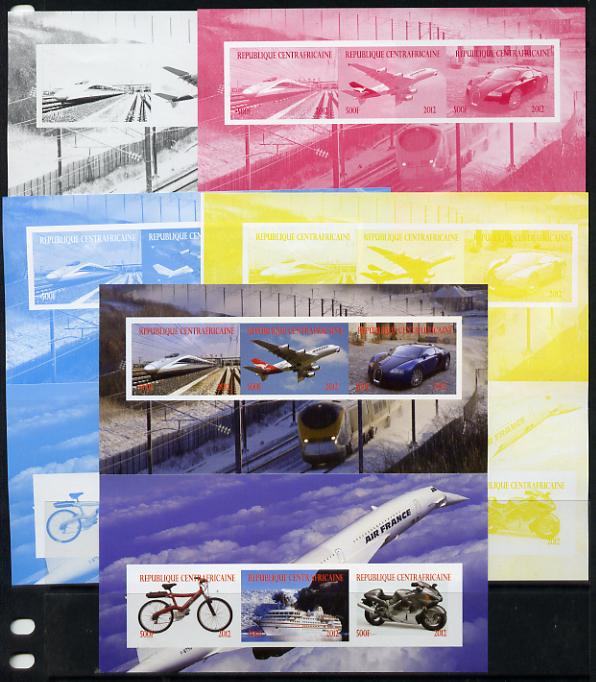 Central African Republic 2012 Transportation sheetlet containing 6 values - the set of 5 imperf progressive proofs comprising the 4 individual colours plus all 4-colour composite, unmounted mint