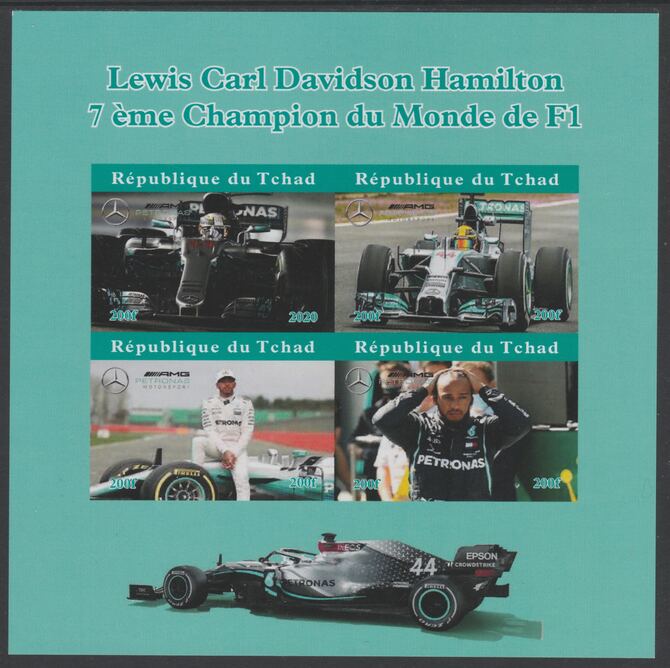 Chad 2020 Lewis Hamilton F1 Champion imperf sheet containing 4 values unmounted mint. Note this item is privately produced and is offered purely on its thematic appeal