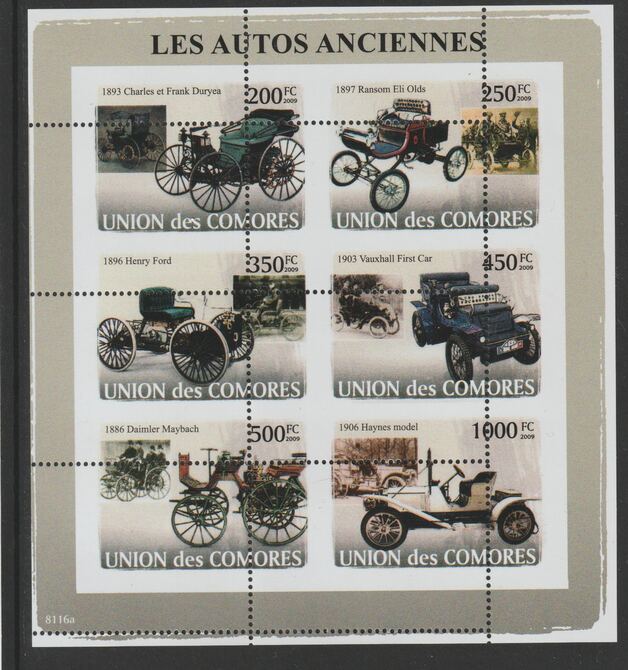 Comoro Islands 2009 Early Motor Cars sheetlet containg 6 value with vertical and horizontal perforations grossly misplaced, unmounted mint