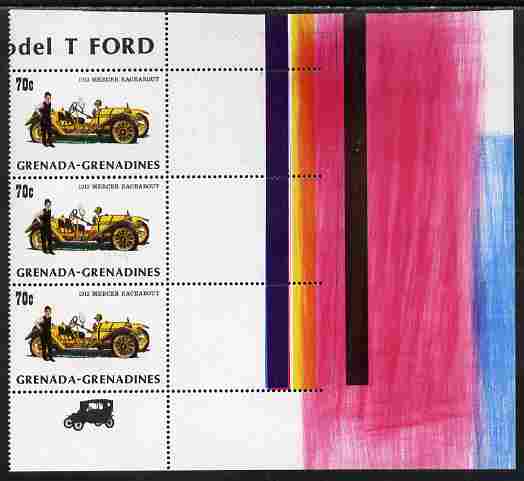 Grenada - Grenadines 1983 75th Anniversary of Model 'T' Ford 70c (1913 Mercer) corner strip of 3 from archive proof sheet showing colour bars with superb wash of magenta colour unmounted mint, as SG 556